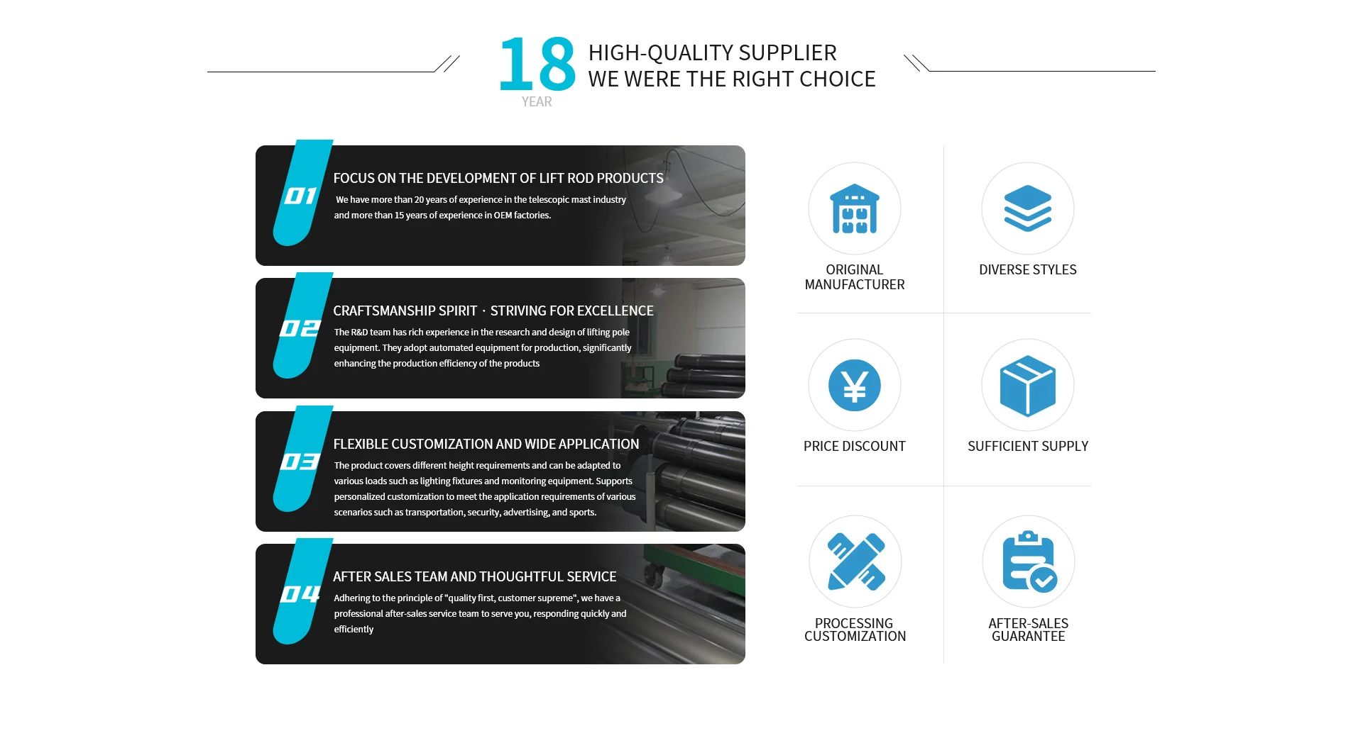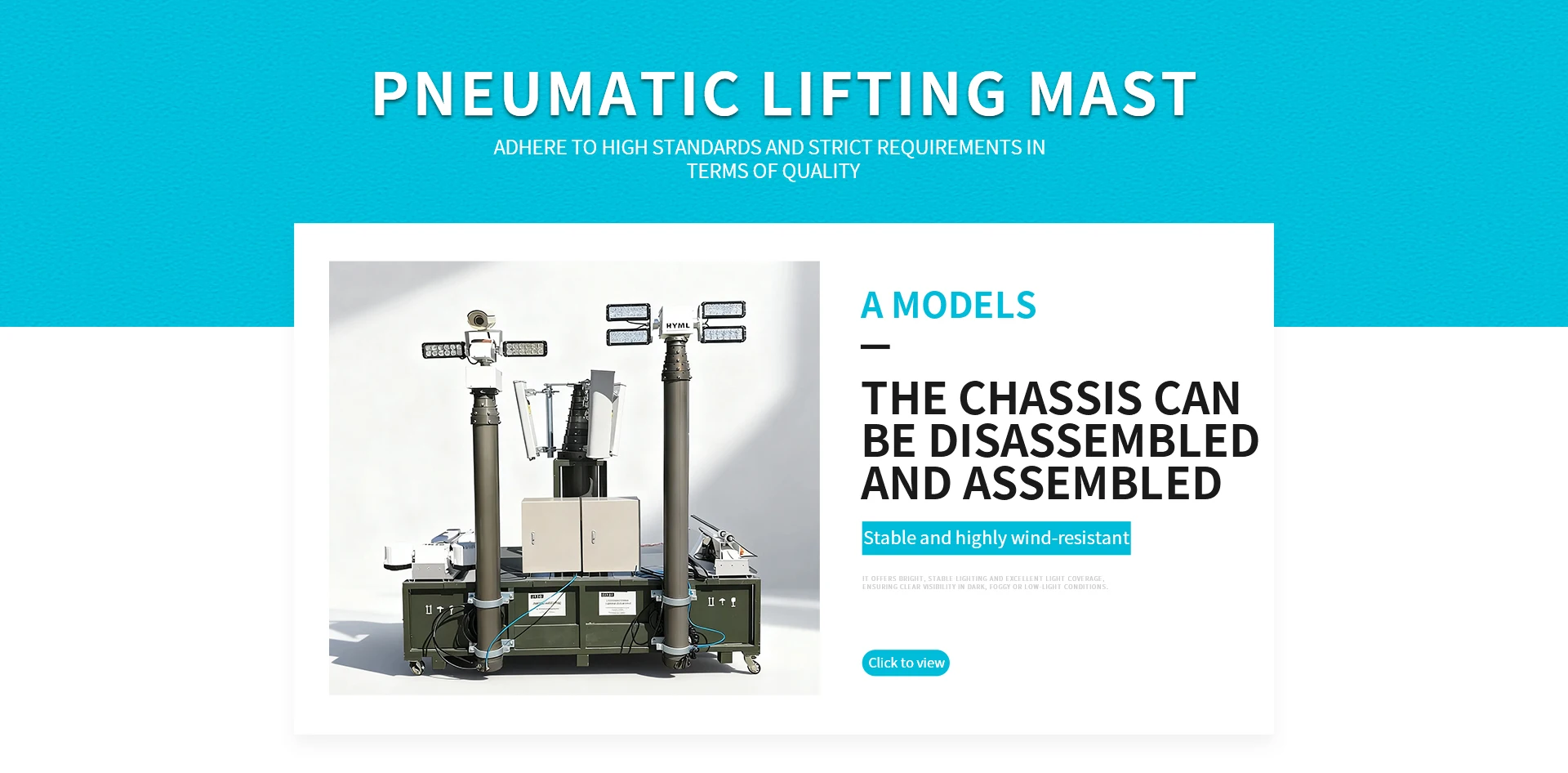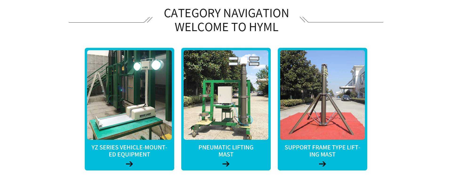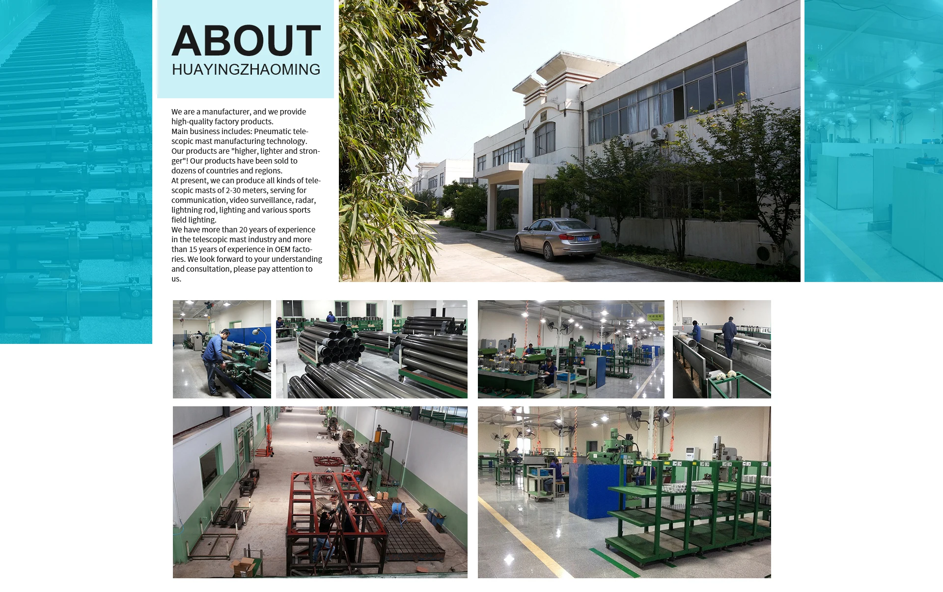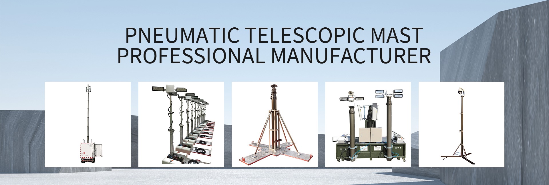 Productos principales:Torre de iluminación montada en el techo del vehículo, mástil telescópico neumático, mástil de antena telescópica, Torre de Telecomunicaciones, mástil telescópico portátil con trípode